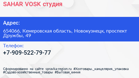 SAHAR & VOSK, студия по адресу 654066, Кемеровская область, Новокузнецк, проспект Дружбы, 49 в дальнейшем Организация, размещена в следующих категориях: