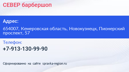 СЕВЕР, барбершоп по адресу 654007, Кемеровская область, Новокузнецк, Пионерский проспект, 57 в дальнейшем Организация, размещена в следующих категориях: