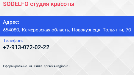 SODELFO, студия красоты по адресу 654080, Кемеровская область, Новокузнецк, Тольятти, 70 в дальнейшем Организация, размещена в следующих категориях: