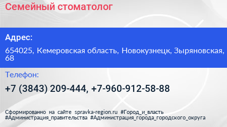 Семейный стоматолог по адресу 654025, Кемеровская область, Новокузнецк, Зыряновская, 68 в дальнейшем Организация, размещена в следующих категориях: