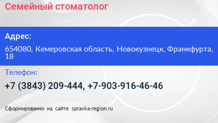 Семейный стоматолог по адресу 654080, Кемеровская область, Новокузнецк, Франкфурта, 18 в дальнейшем Организация, размещена в следующих категориях: