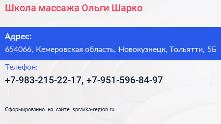 Школа массажа Ольги Шарко по адресу 654066, Кемеровская область, Новокузнецк, Тольятти, 5Б в дальнейшем Организация, размещена в следующих категориях: