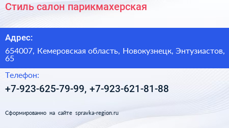 Стиль, салон-парикмахерская по адресу 654007, Кемеровская область, Новокузнецк, Энтузиастов, 65 в дальнейшем Организация, размещена в следующих категориях: