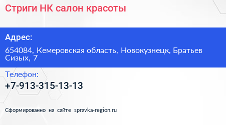 Стриги-НК, салон красоты по адресу 654084, Кемеровская область, Новокузнецк, Братьев Сизых, 7 в дальнейшем Организация, размещена в следующих категориях: