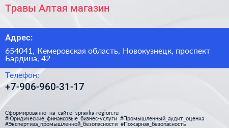 Травы Алтая, магазин по адресу 654041, Кемеровская область, Новокузнецк, проспект Бардина, 42 в дальнейшем Организация, размещена в следующих категориях: