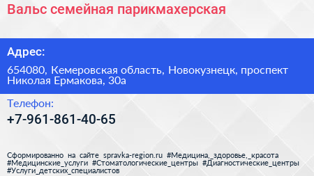 Вальс, семейная парикмахерская по адресу 654080, Кемеровская область, Новокузнецк, проспект Николая Ермакова, 30а в дальнейшем Организация, размещена в следующих категориях: