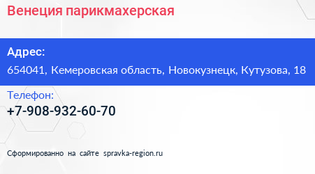 Венеция, парикмахерская по адресу 654041, Кемеровская область, Новокузнецк, Кутузова, 18 в дальнейшем Организация, размещена в следующих категориях:
