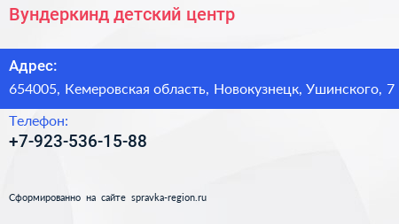 Вундеркинд, детский центр по адресу 654005, Кемеровская область, Новокузнецк, Ушинского, 7 в дальнейшем Организация, размещена в следующих категориях: