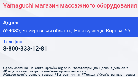 Yamaguchi, магазин массажного оборудования по адресу 654080, Кемеровская область, Новокузнецк, Кирова, 55 в дальнейшем Организация, размещена в следующих категориях: