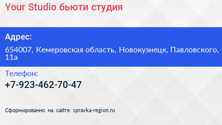 Your Studio, бьюти-студия по адресу 654007, Кемеровская область, Новокузнецк, Павловского, 11а в дальнейшем Организация, размещена в следующих категориях: