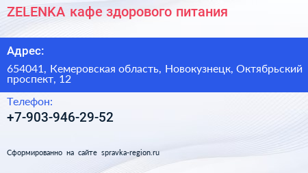 ZELENKA, кафе здорового питания по адресу 654041, Кемеровская область, Новокузнецк, Октябрьский проспект, 12 в дальнейшем Организация, размещена в следующих категориях: