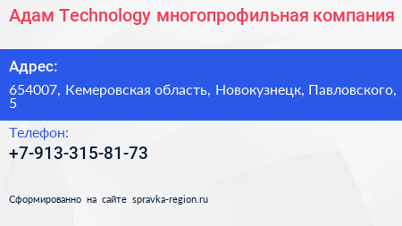 Адам Technology, многопрофильная компания по адресу 654007, Кемеровская область, Новокузнецк, Павловского, 5 в дальнейшем Организация, размещена в следующих категориях: