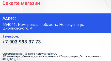 Dekarte, магазин по адресу 654041, Кемеровская область, Новокузнецк, Циолковского, 4 в дальнейшем Организация, размещена в следующих категориях: