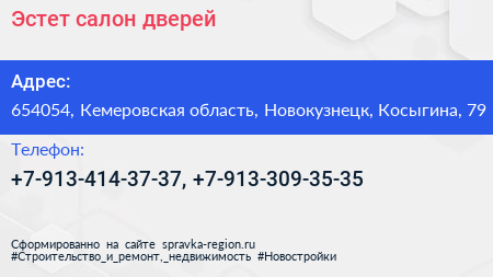 Эстет, салон дверей по адресу 654054, Кемеровская область, Новокузнецк, Косыгина, 79 в дальнейшем Организация, размещена в следующих категориях: