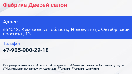 Фабрика Дверей, салон по адресу 654018, Кемеровская область, Новокузнецк, Октябрьский проспект, 13 в дальнейшем Организация, размещена в следующих категориях:
