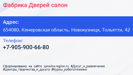Фабрика Дверей, салон по адресу 654080, Кемеровская область, Новокузнецк, Тольятти, 42 в дальнейшем Организация, размещена в следующих категориях: