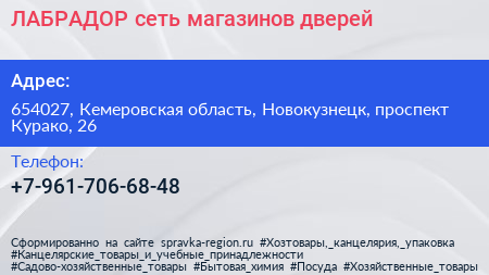ЛАБРАДОР, сеть магазинов дверей по адресу 654027, Кемеровская область, Новокузнецк, проспект Курако, 26 в дальнейшем Организация, размещена в следующих категориях: