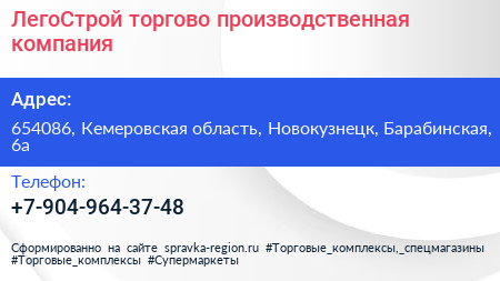 ЛегоСтрой, торгово-производственная компания по адресу 654086, Кемеровская область, Новокузнецк, Барабинская, 6а в дальнейшем Организация, размещена в следующих категориях:
