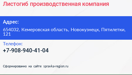 Листогиб, производственная компания по адресу 654032, Кемеровская область, Новокузнецк, Пятилетки, 121 в дальнейшем Организация, размещена в следующих категориях: