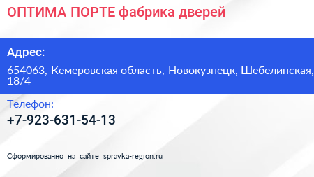 ОПТИМА ПОРТЕ, фабрика дверей по адресу 654063, Кемеровская область, Новокузнецк, Шебелинская, 18/4 в дальнейшем Организация, размещена в следующих категориях: