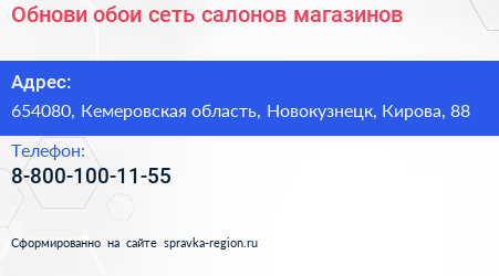 Обнови обои, сеть салонов-магазинов по адресу 654080, Кемеровская область, Новокузнецк, Кирова, 88 в дальнейшем Организация, размещена в следующих категориях: