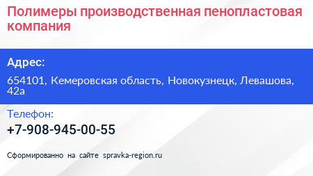 Полимеры, производственная пенопластовая компания по адресу 654101, Кемеровская область, Новокузнецк, Левашова, 42а в дальнейшем Организация, размещена в следующих категориях: