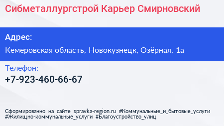 Сибметаллургстрой & Карьер Смирновский по адресу Кемеровская область, Новокузнецк, Озёрная, 1а в дальнейшем Организация, размещена в следующих категориях: