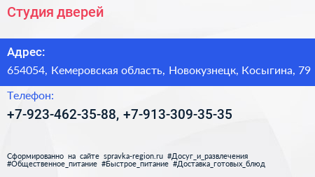 Студия дверей по адресу 654054, Кемеровская область, Новокузнецк, Косыгина, 79 в дальнейшем Организация, размещена в следующих категориях: