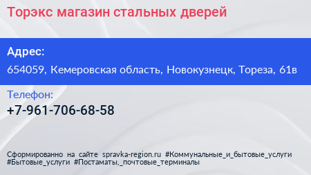 Торэкс, магазин стальных дверей по адресу 654059, Кемеровская область, Новокузнецк, Тореза, 61в в дальнейшем Организация, размещена в следующих категориях: