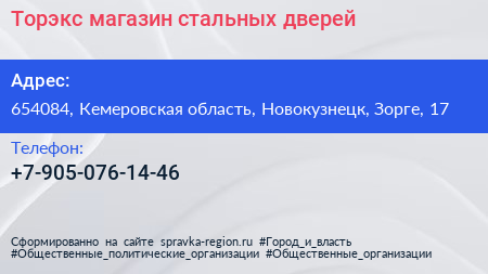 Торэкс, магазин стальных дверей по адресу 654084, Кемеровская область, Новокузнецк, Зорге, 17 в дальнейшем Организация, размещена в следующих категориях: