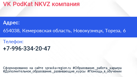 VK.PodKat.NKVZ, компания по адресу 654038, Кемеровская область, Новокузнецк, Тореза, 6 в дальнейшем Организация, размещена в следующих категориях: