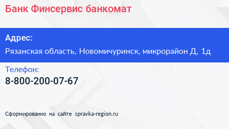 Банк Финсервис, банкомат по адресу Рязанская область, Новомичуринск, микрорайон Д, 1д в дальнейшем Организация, размещена в следующих категориях: