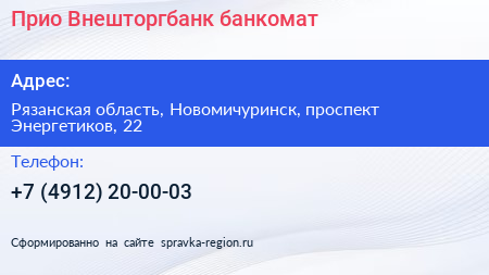 Прио-Внешторгбанк, банкомат по адресу Рязанская область, Новомичуринск, проспект Энергетиков, 22 в дальнейшем Организация, размещена в следующих категориях: