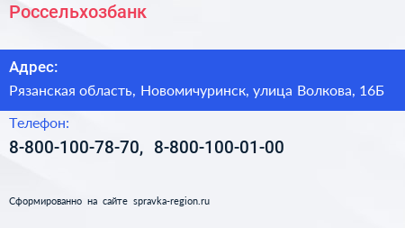 Россельхозбанк по адресу Рязанская область, Новомичуринск, улица Волкова, 16Б в дальнейшем Организация, размещена в следующих категориях: