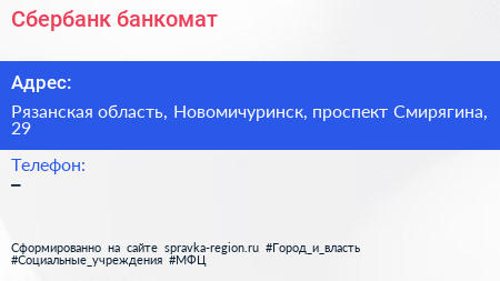 Сбербанк, банкомат по адресу Рязанская область, Новомичуринск, проспект Смирягина, 29 в дальнейшем Организация, размещена в следующих категориях: