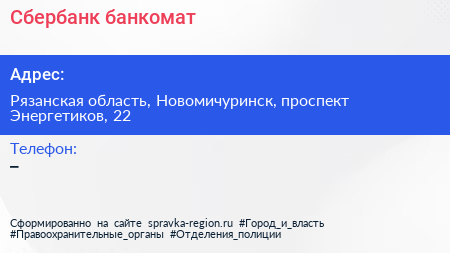 Сбербанк, банкомат по адресу Рязанская область, Новомичуринск, проспект Энергетиков, 22 в дальнейшем Организация, размещена в следующих категориях: