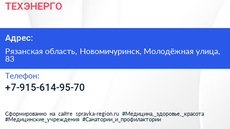 ТЕХЭНЕРГО по адресу Рязанская область, Новомичуринск, Молодёжная улица, 83 в дальнейшем Организация, размещена в следующих категориях: