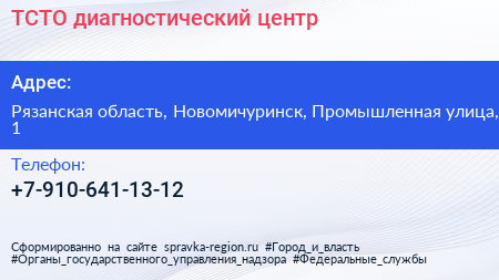 ТСТО, диагностический центр по адресу Рязанская область, Новомичуринск, Промышленная улица, 1 в дальнейшем Организация, размещена в следующих категориях: