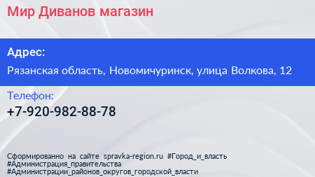 Мир Диванов, магазин по адресу Рязанская область, Новомичуринск, улица Волкова, 12 в дальнейшем Организация, размещена в следующих категориях: