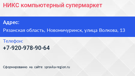 НИКС, компьютерный супермаркет по адресу Рязанская область, Новомичуринск, улица Волкова, 13 в дальнейшем Организация, размещена в следующих категориях: