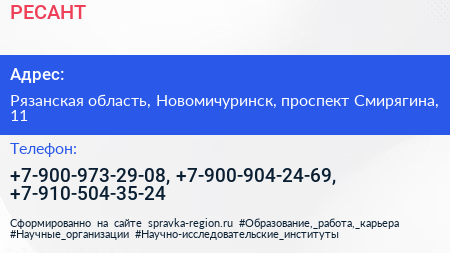 РЕСАНТ по адресу Рязанская область, Новомичуринск, проспект Смирягина, 11 в дальнейшем Организация, размещена в следующих категориях: