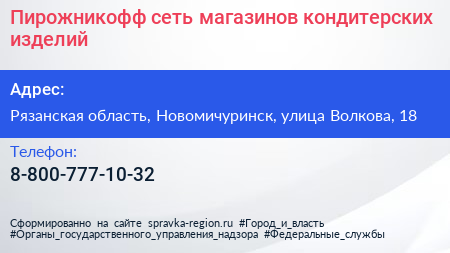 Пирожникофф, сеть магазинов кондитерских изделий по адресу Рязанская область, Новомичуринск, улица Волкова, 18 в дальнейшем Организация, размещена в следующих категориях: