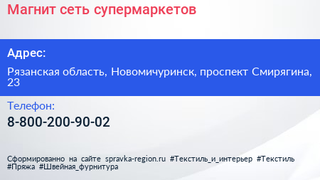 Магнит, сеть супермаркетов по адресу Рязанская область, Новомичуринск, проспект Смирягина, 23 в дальнейшем Организация, размещена в следующих категориях: