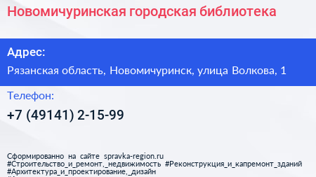 Новомичуринская городская библиотека по адресу Рязанская область, Новомичуринск, улица Волкова, 1 в дальнейшем Организация, размещена в следующих категориях: