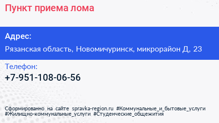 Пункт приема лома по адресу Рязанская область, Новомичуринск, микрорайон Д, 23 в дальнейшем Организация, размещена в следующих категориях: