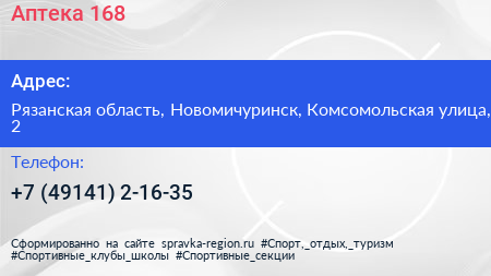 Аптека №168 по адресу Рязанская область, Новомичуринск, Комсомольская улица, 2 в дальнейшем Организация, размещена в следующих категориях: