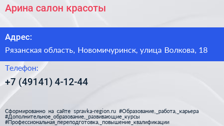 Арина, салон красоты по адресу Рязанская область, Новомичуринск, улица Волкова, 18 в дальнейшем Организация, размещена в следующих категориях: