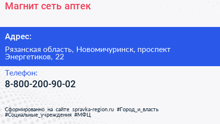 Магнит, сеть аптек по адресу Рязанская область, Новомичуринск, проспект Энергетиков, 22 в дальнейшем Организация, размещена в следующих категориях: