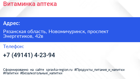 Витаминка, аптека по адресу Рязанская область, Новомичуринск, проспект Энергетиков, 42в в дальнейшем Организация, размещена в следующих категориях:
