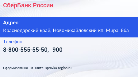 СберБанк России по адресу Краснодарский край, Новомихайловский кп, Мира, 86а в дальнейшем Организация, размещена в следующих категориях: